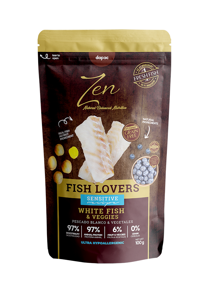 Alimento completo semihúmedo super premium para perros. Receta sensitive especial para estómagos sensibles. Proceso de cocción lenta al vapor para mantener intacta la proteína. Digestiones sencillas. Verdadero pescado blanco como primer ingrediente.