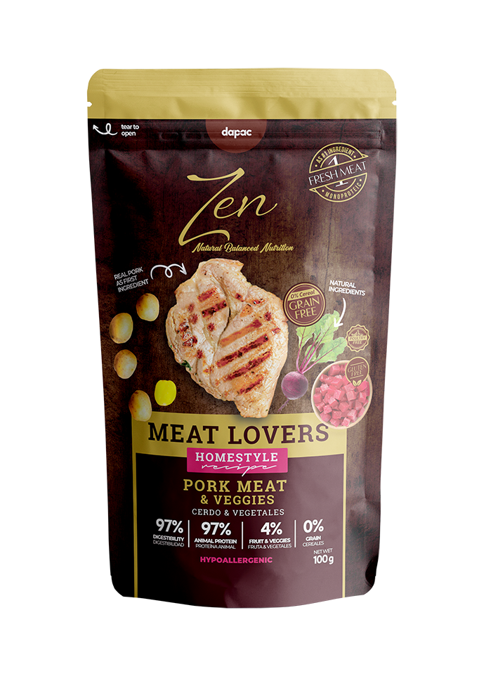 Alimento completo semihúmedo super premium para perros. Elaborado y bajo un proceso de cocción natural. Receta de cerdo y vegetales.