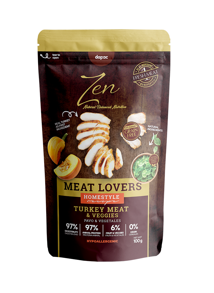 Alimento completo semihúmedo super premium para perros. Elaborado con y bajo un proceso de cocción natural. Receta pavo y vegetales. Digestiones sencillas. Verdadero pavo primer ingrediente.